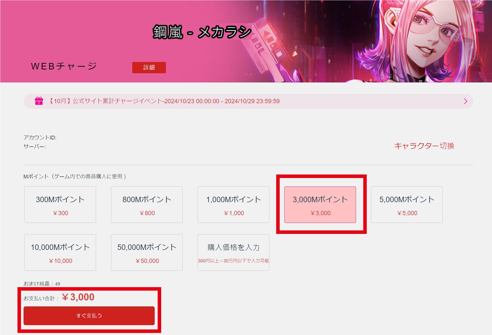購入前に【キャラクター名】【キャラクターID】【サーバー】を確認し、購入したい額面の【Mポイント】を選択した後、【すぐ支払う】をクリックしてお支払いにお進みください。